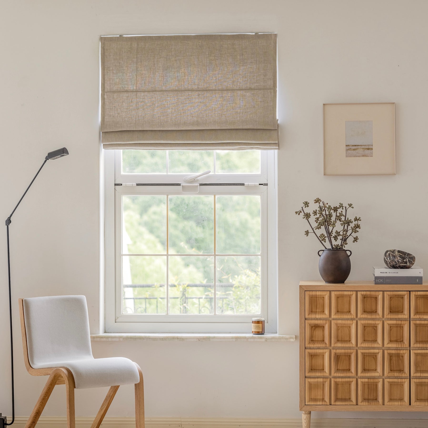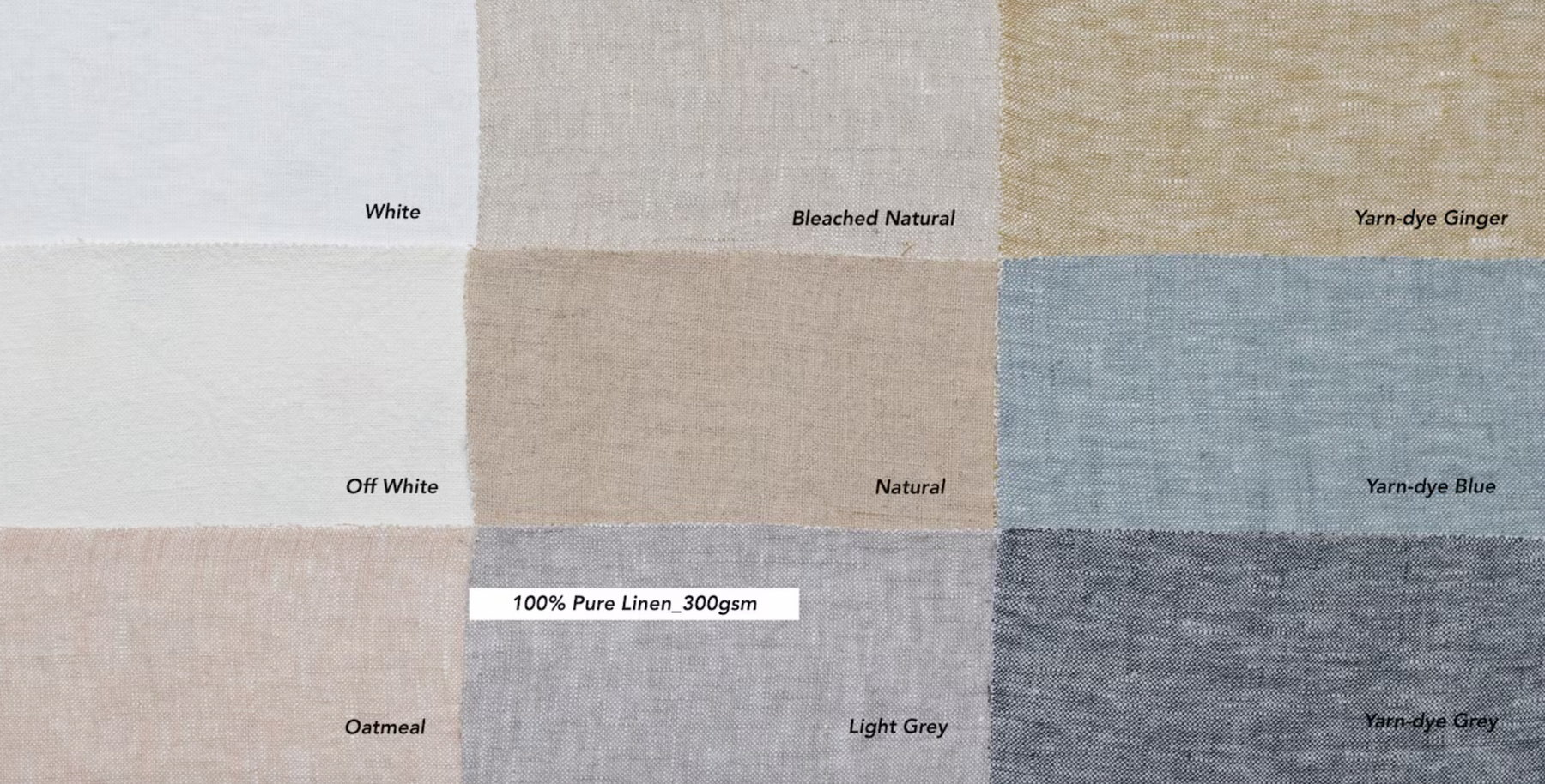 Featured: 100% Pure Linen 300gsm Natural with white lining, flat fold with dowels, stacks to ~9" when raised.